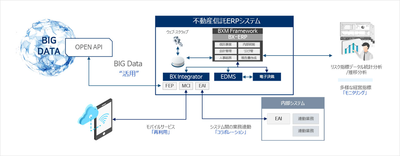 重複業務の簡素化、ルーティン作業の自動化、ERPと営業・購買システムとの連携による全社統合ポータル、外部機関データやシステムとの連携