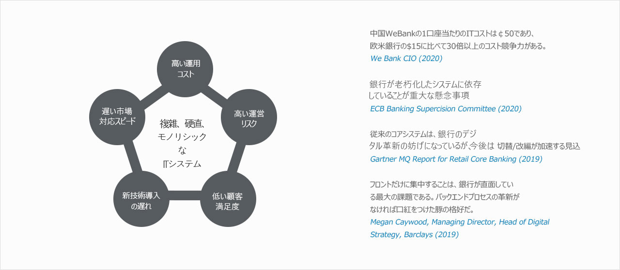 継続的なIT投資にもかかわらず、世界中の多くの銀行のレガシーITシステムは、顧客経験、コスト、リスクなど多方面において競争力を失っています。