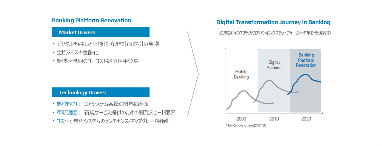 インターネットとモバイル革命以降、20年間続いた銀行のDXへの旅程は、これからはコアシステムの問題解決に向けた、コアバンキングプラット