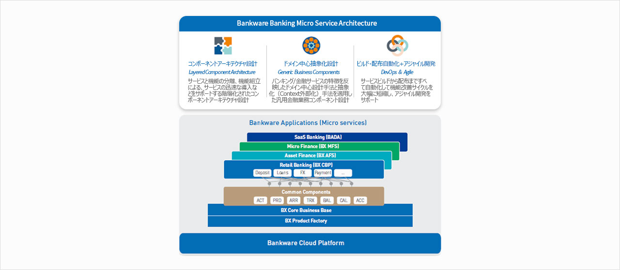 バンクウェアグローバルのコアバンキングプラットフォームは、金融商品取引の特性とアプリケーションの複雑度を考慮したマイクロサービスアーキテクチャで設計し、アプリケーション開発の生産性と運用性能を最大化させ、超大型分散データベース技術をクラウド上で具現し、実質的には無制限に性能改善できる技術を保有しています。