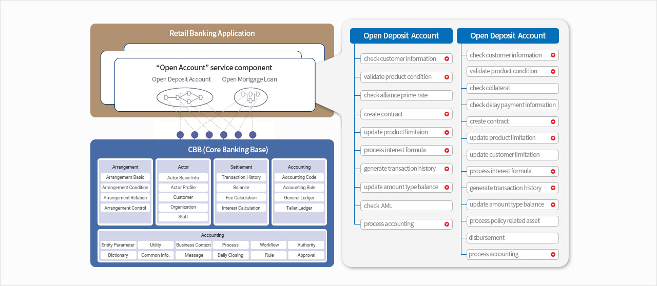 バンクウェアグローバルのコアバンキングプラットフォームの最大の長所は、どのような銀行、クレジットカード会社、キャピタル会社の金融商品や業務プロセスでも、容易かつ迅速に構築・拡張できる共通金融業務フレームワークを内蔵していることです。