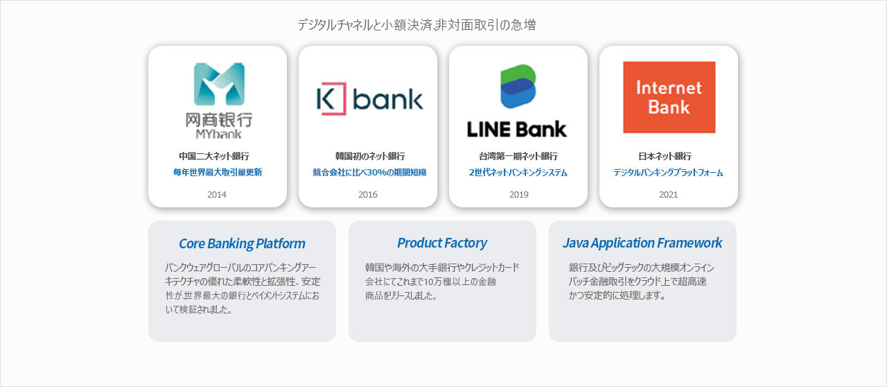 バンクウェアグローバルのコアバンキングソリューションは、東アジア各国のビッグテック企業が主導するネット専門銀行のコアシステムとして
